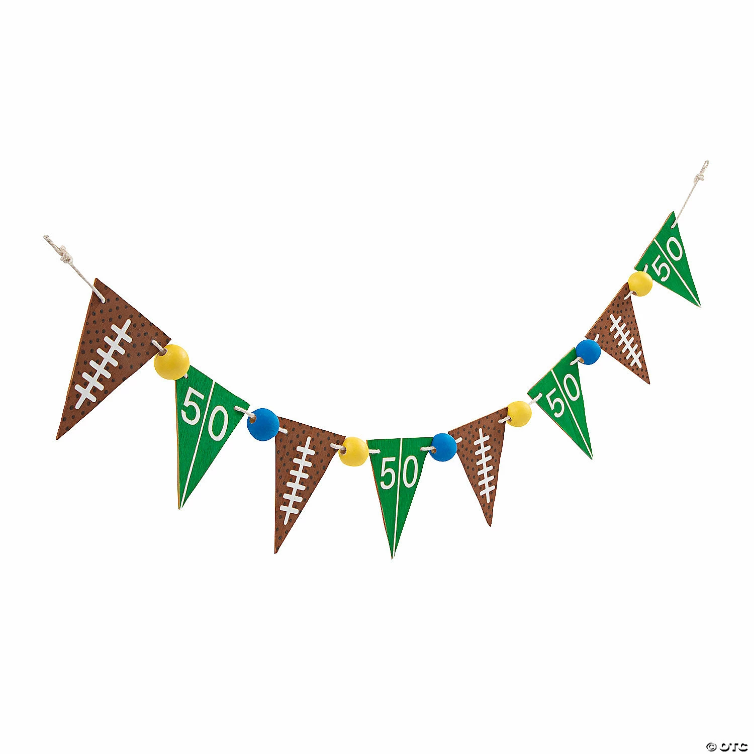 Get your craft on while cheering for your favorite team! This craft kit for adults features unfinished wood pieces that can be decorated using your own paint and other embellishments in your team colors. When your project is complete, hang your masterpiece as part of your fall dΓ©cor or just during your football viewing parts to help set a winning mood! (1 kit per unit) 42″ x 4″ Β© OTCDiy Football Pennant Garland Instructions