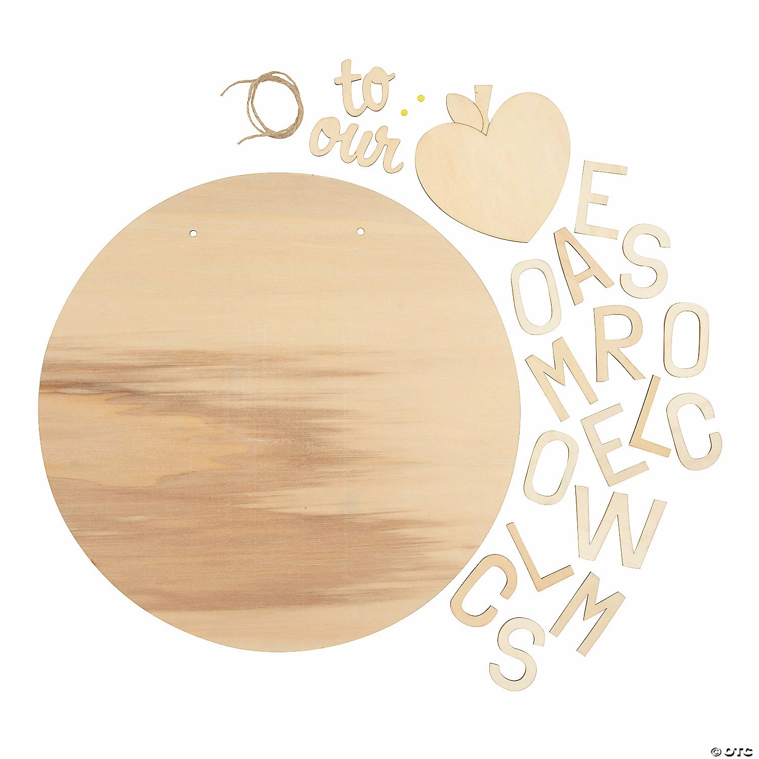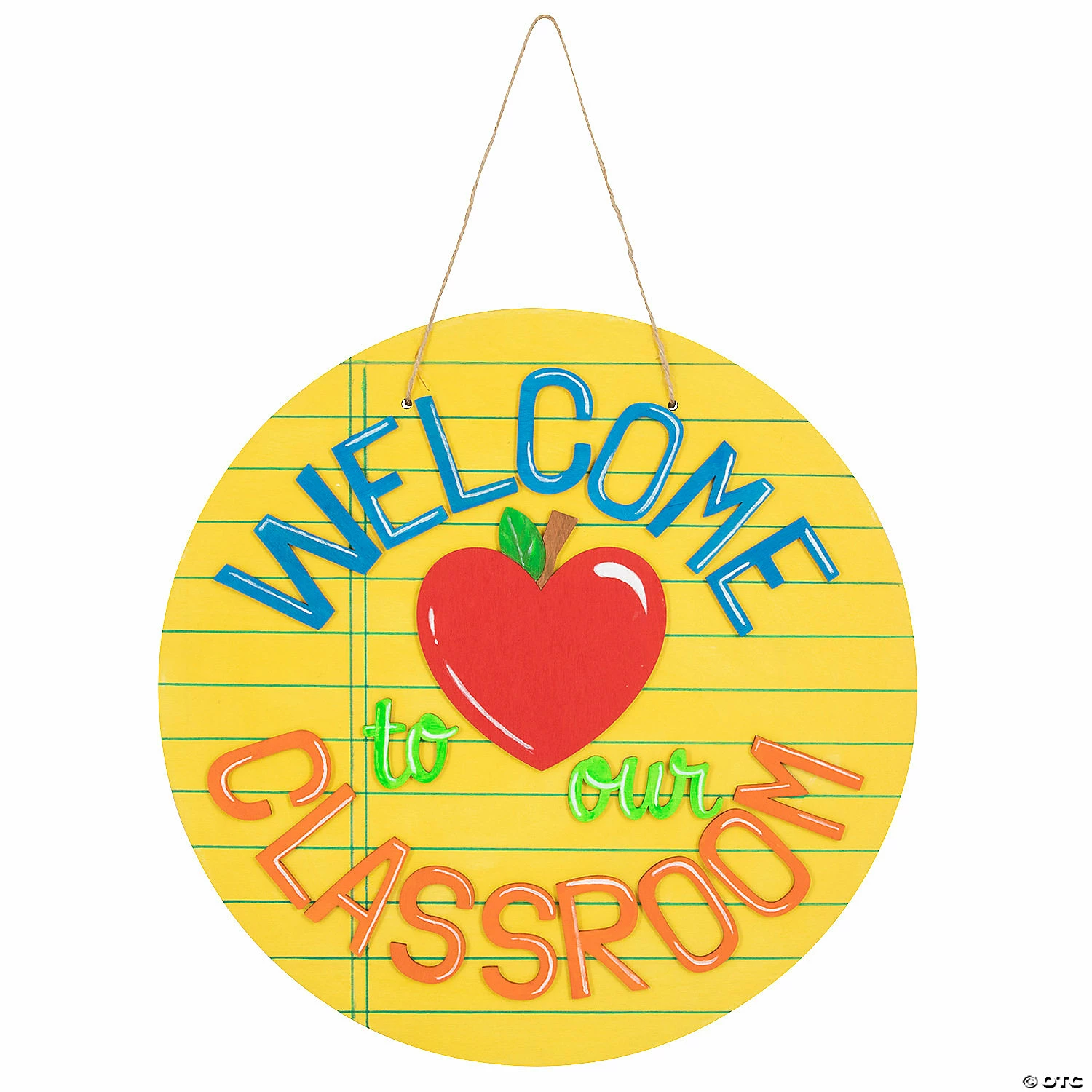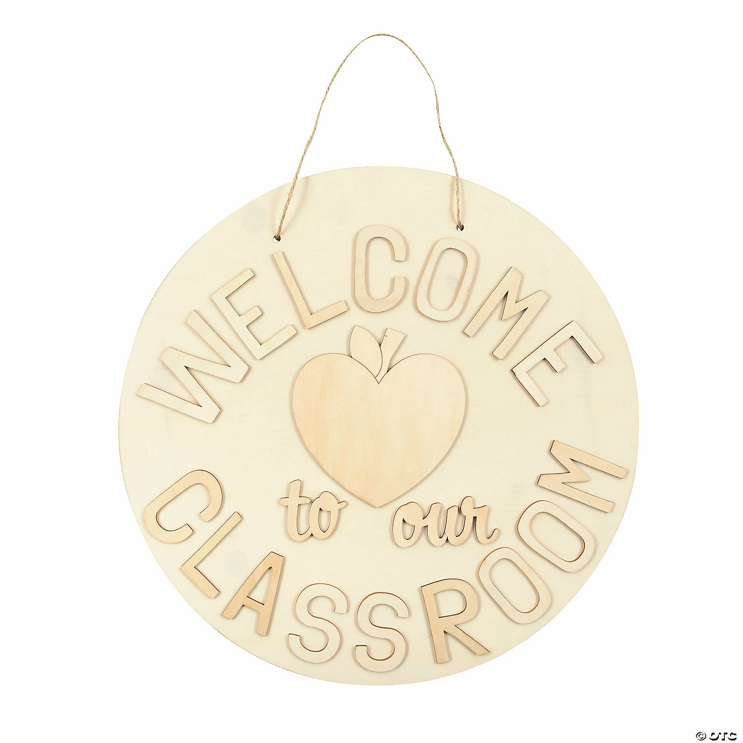 Greet your students every morning with this adorable door sign! This DIY craft project features a heart-shaped apple and letters that spell out the message βWelcome to our Classroomβ. Decorate it with paint, glitter and other embellishments then hang on your classroom door to welcome all visitors. Wood with jute cording. 15″ diam. Some glue required, sold separately. Simple assembly required. Β© OTC