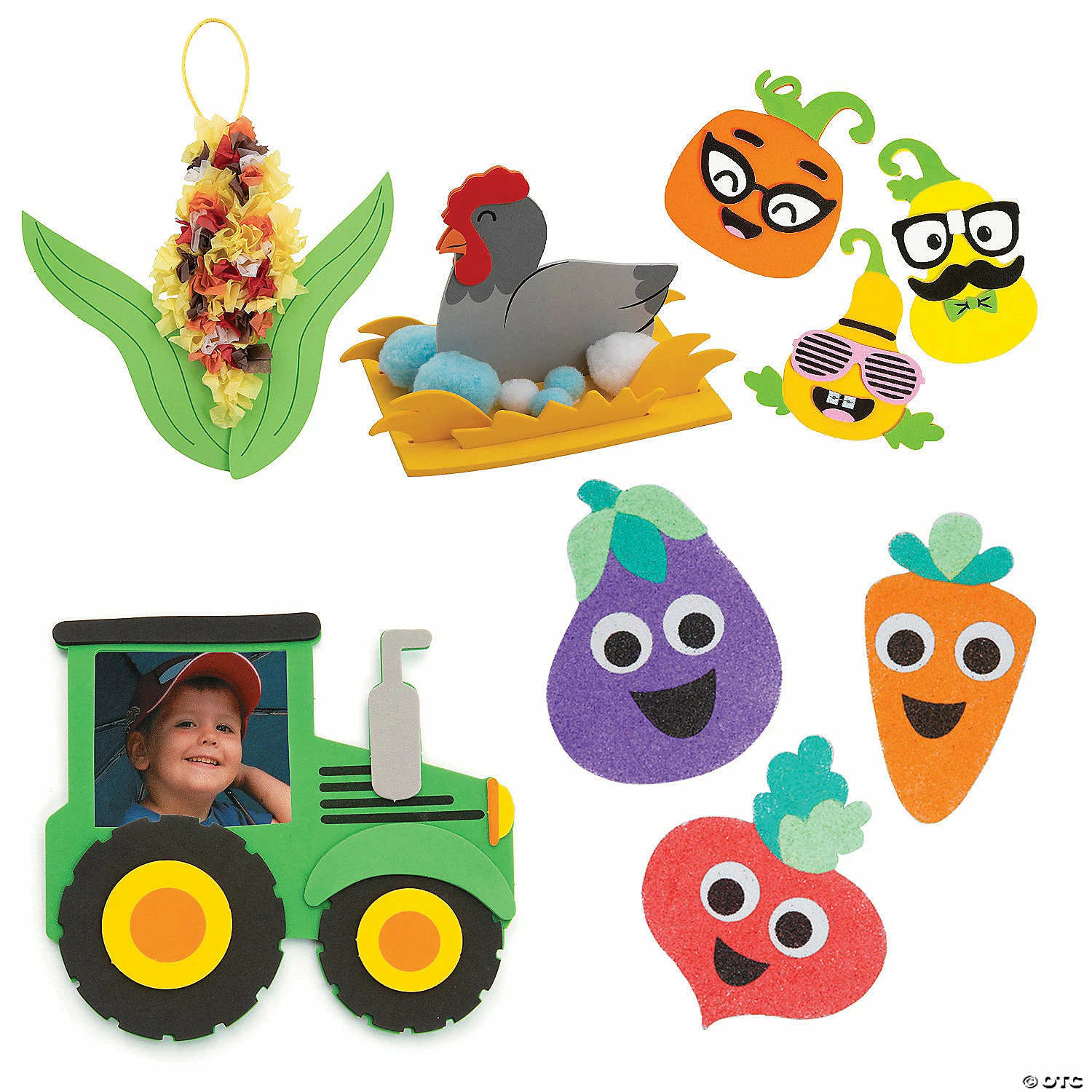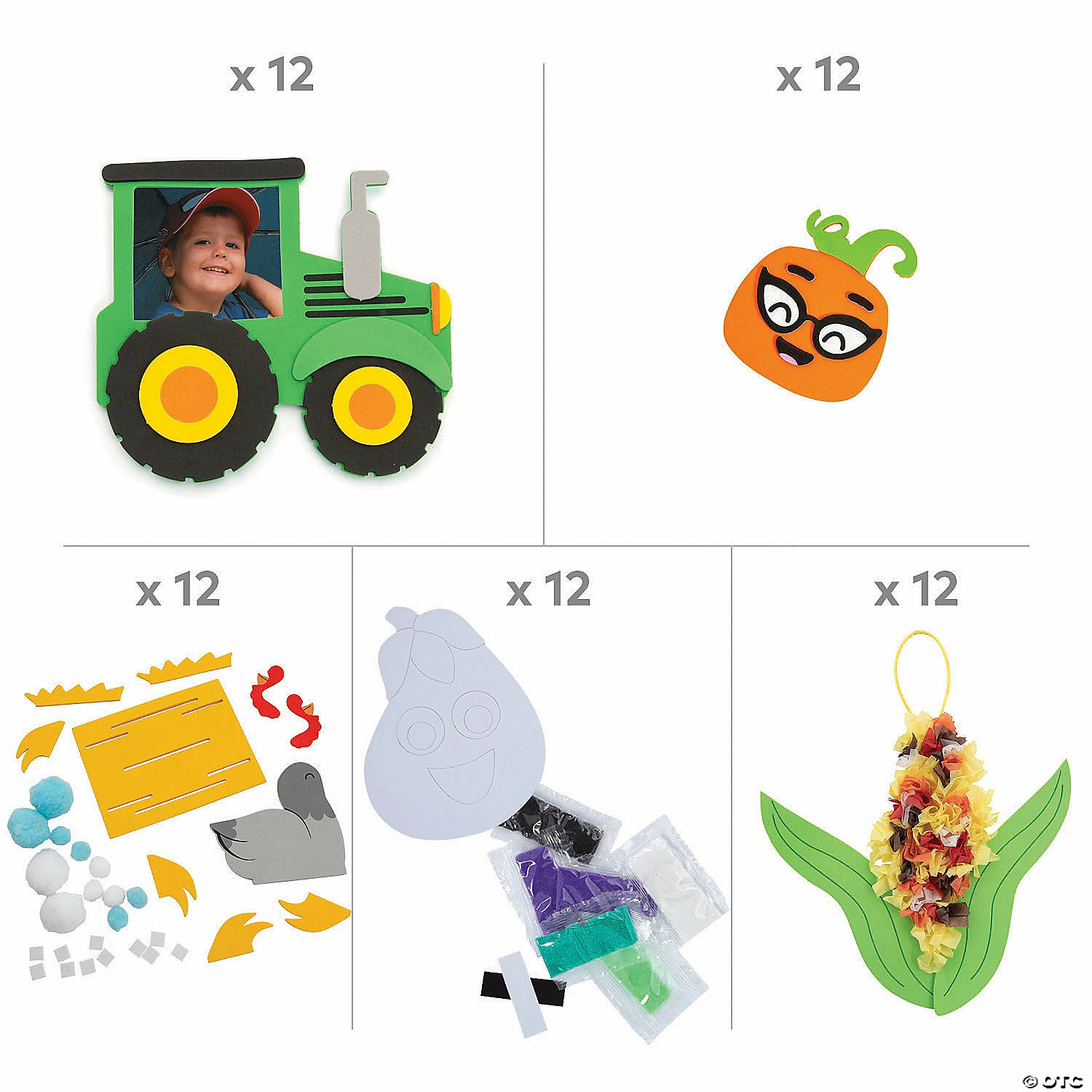 Celebrate the fall season with this bounty of farm-fresh crafts! This kit is packed with tons of fall crafting supplies and instructions. Kids will enjoy creating several different fall-themed items, including a glittering spool pumpkin, a fall farmerβs truck, a farmerβs market magnet, and so much more! This kit comes with enough supplies to make 12 of each craft item. Makes 60. Assortment may vary. All craft kit pieces are pre-packaged for individual use. Kits include instructions.Includes: β’ 12 Festive Fall Corn Craft Kits (Includes self-adhesive foam and tissue paper. 8 1/2″)β’ 12 Goofy Gourd Magnet Craft Kits (Includes self-adhesive foam pieces. 4″ – 4 1/2″ Magnets are packaged separately. Do not discard.)β’ 12 3D Nesting Hen Craft Kits (Includes self-adhesive foam pieces and polyester pom-poms. 8″ x 5″ x 5 1/4″)β’ 12 Fall Harvest Veggies Sand Art Magnets (Each self-adhesive sticky board includes bags of assorted color sand. Cardstock. 2-3/4″ – 4″ x 5″)β’ 12 Tractor Picture Frame Magnet Craft Kits (Includes self-adhesive foam pieces. 7″ x 6 1/4″ with a 2 1/2″ x 3″ photo space. Magnets are packaged separately do not discard.)β’ Assortments are subject to change at any time and may vary from picture shown. Substituted items will be similar in nature.