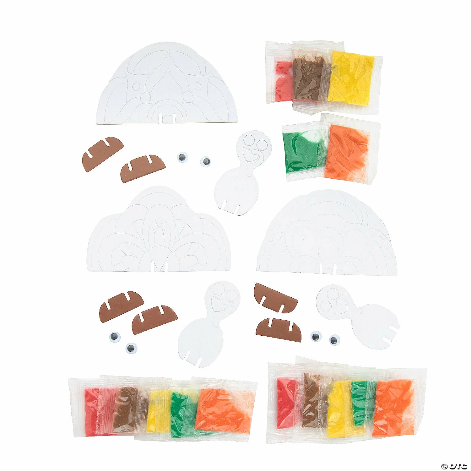 You’ve heard of a turkey sandwich, but have you ever heard of turkey sand art? This unique Thanksgiving craft project features three different DIY mandala feather design patterns so guests can pick their favorite flockstar to use as a name card holder or table decoration at Thanksgiving dinner. Turkey sand art craft kits also make tantalizing Thanksgiving classroom projects. Includes sticky boards, cover sheets, googly eyes and bags of assorted color sand. Cardstock. 3″ x 1 1/2″ x 5″ Makes 12. All craft kit pieces are pre-packaged for individual use. Kits include instructions. ยฉ OTC