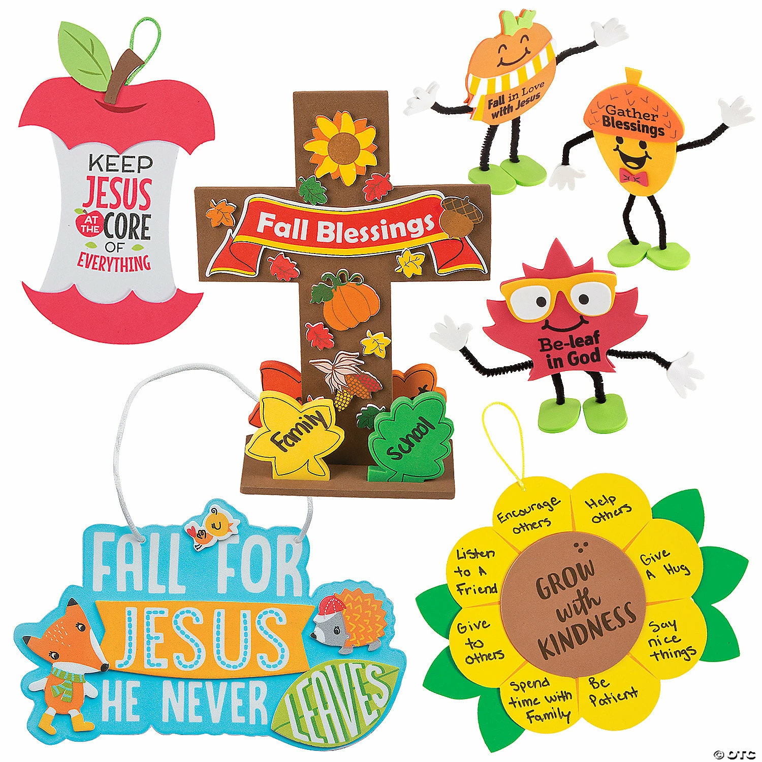 This fall craft kit assortment will remind kids that God will never “leaf” them! Pass them out during Sunday School or during VBS craft time to celebrate fall in a fun and unique way. The completed crafts can be used to decorate the classroom or kids can use them to decorate their home throughout the autumn season. (120 pcs. per unit) All craft kit pieces are pre-packaged for individual use. Kits include instructions. Assortment may vary.Includes:โข 24 Fall Blessings Stand-Up Cross Craft Kits (Includes self-adhesive foam pieces. 6″ x 8 1/2″)โข 24 3D Fall Faith Stand-Up Craft Kits (Includes self-adhesive foam pieces and chenille stems. 3″ x 5-1/2″)โข 24 Be Kind Sunflower Craft Kits (Includes self-adhesive foam pieces, cardstock sheet and satin cord. 8 1/2″ x 7 1/2″)โข 24 Fall for Jesus Animal Sign Craft Kits (Includes self-adhesive foam pieces and satin cording. 7″ x 4 1/2″)โข 24 Jesus Is the Core Apple Craft Kits (Includes self-adhesive foam pieces and satin cording. 6″)