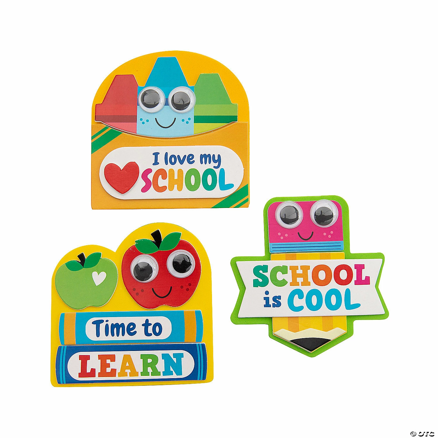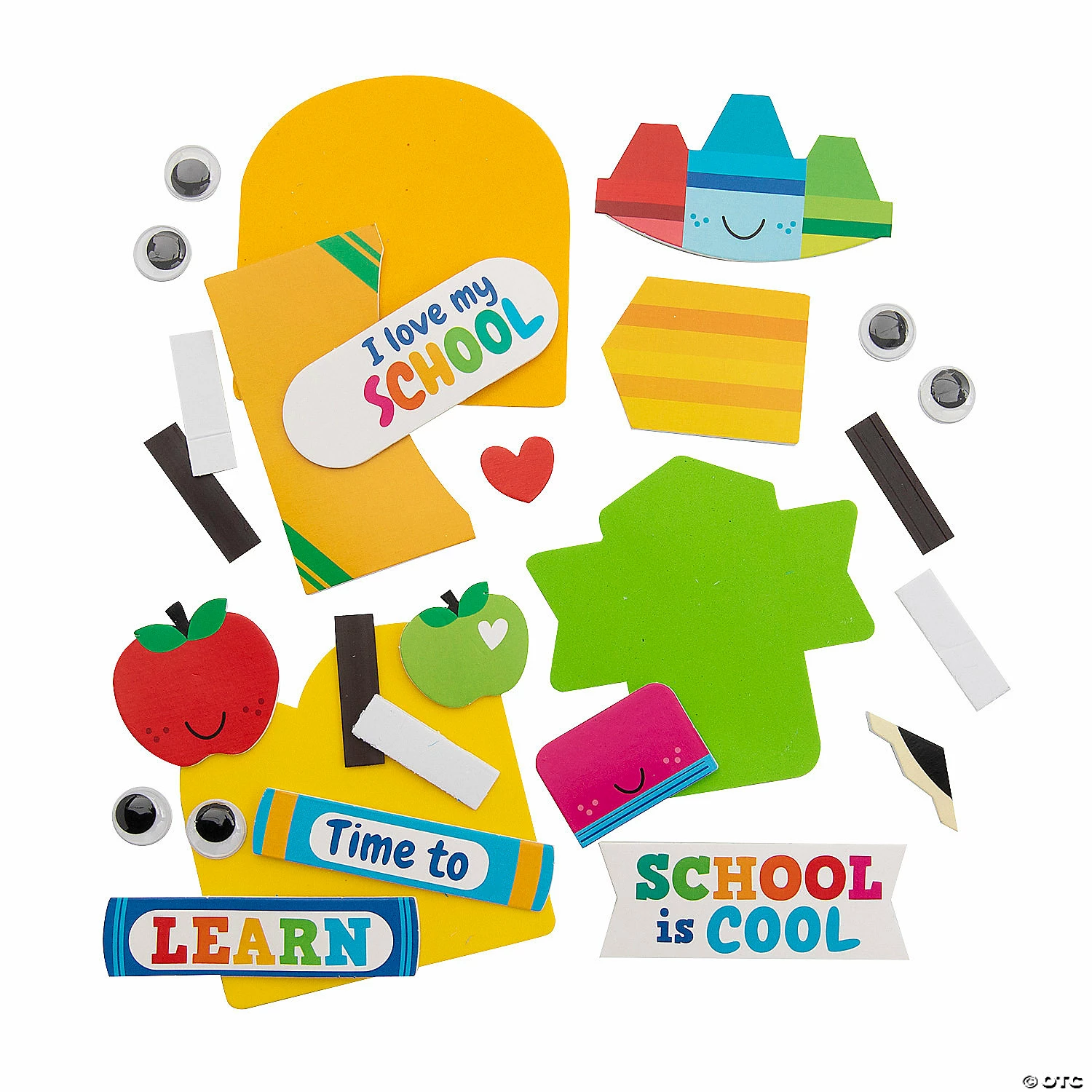 Whether itβs the first day of school, the last day of school, or the 100th day of school, thereβs no bad time to celebrate school spirit. With phrases including “School is Cool”, “Time to Learn” and “I Love My School”, this magnet craft activity is a fun way for kids to get excited about learning. Students graduating from one grade can create them and give them to the kids who will have their desk the next year. Includes self-adhesive foam pieces, magnets and plastic googly eyes. 4″ x 4″ Makes 12. All craft kit pieces are pre-packaged for individual use. Magnets are packaged separately. Do not discard. Kits include instructions. Β© OTC