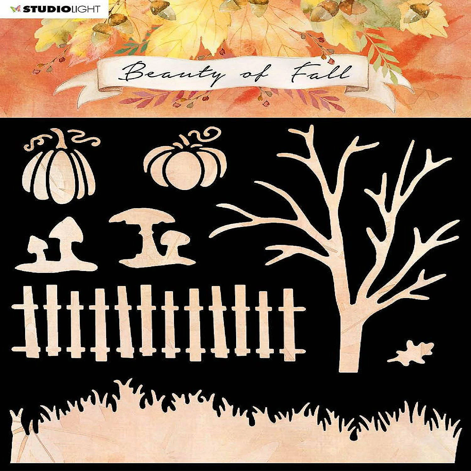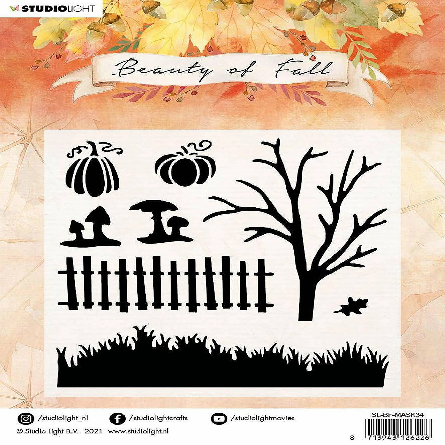 SL Mask Scenery Beauty Of Fall 150x150mm nr.34 This mask will help build a great Fall scene for cards, mixed media projects, journals and more. Includes a fence, a tree, grass, pumpkins and toadstools. The Beauty of Fall collection has all kinds of elements to make all the fall sceneries you want. The collection contains 4 A6 clear stamps with fall designs you can color and text stamps to finish off your projects. The collection also contains 4 A6 cutting die sets and 2 masks. Use the masks to set the base of the scenery with grass and leaves and add the cutting dies, stamps and other elements to add in all the details. Size: 6 x 6 inches.